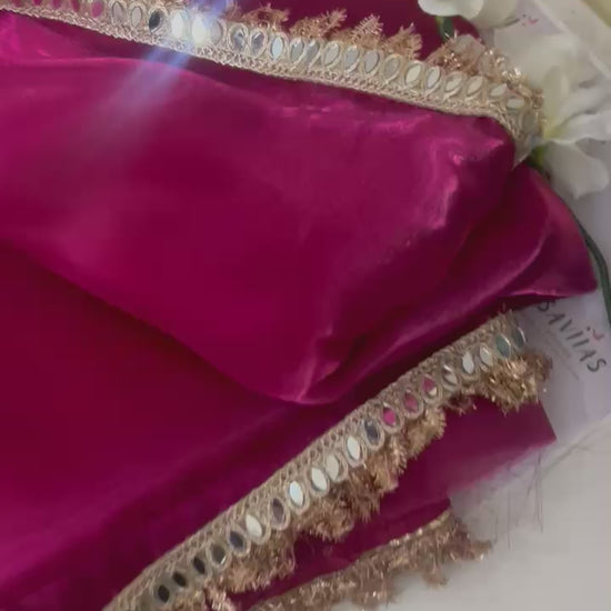 Wrapped in the richness of hot pink silk, adorned with a golden mirror lace border and zari detailing, this saree sparkles like starlight. Perfect for weddings, receptions, and festive occasions where you wish to shine with grace.