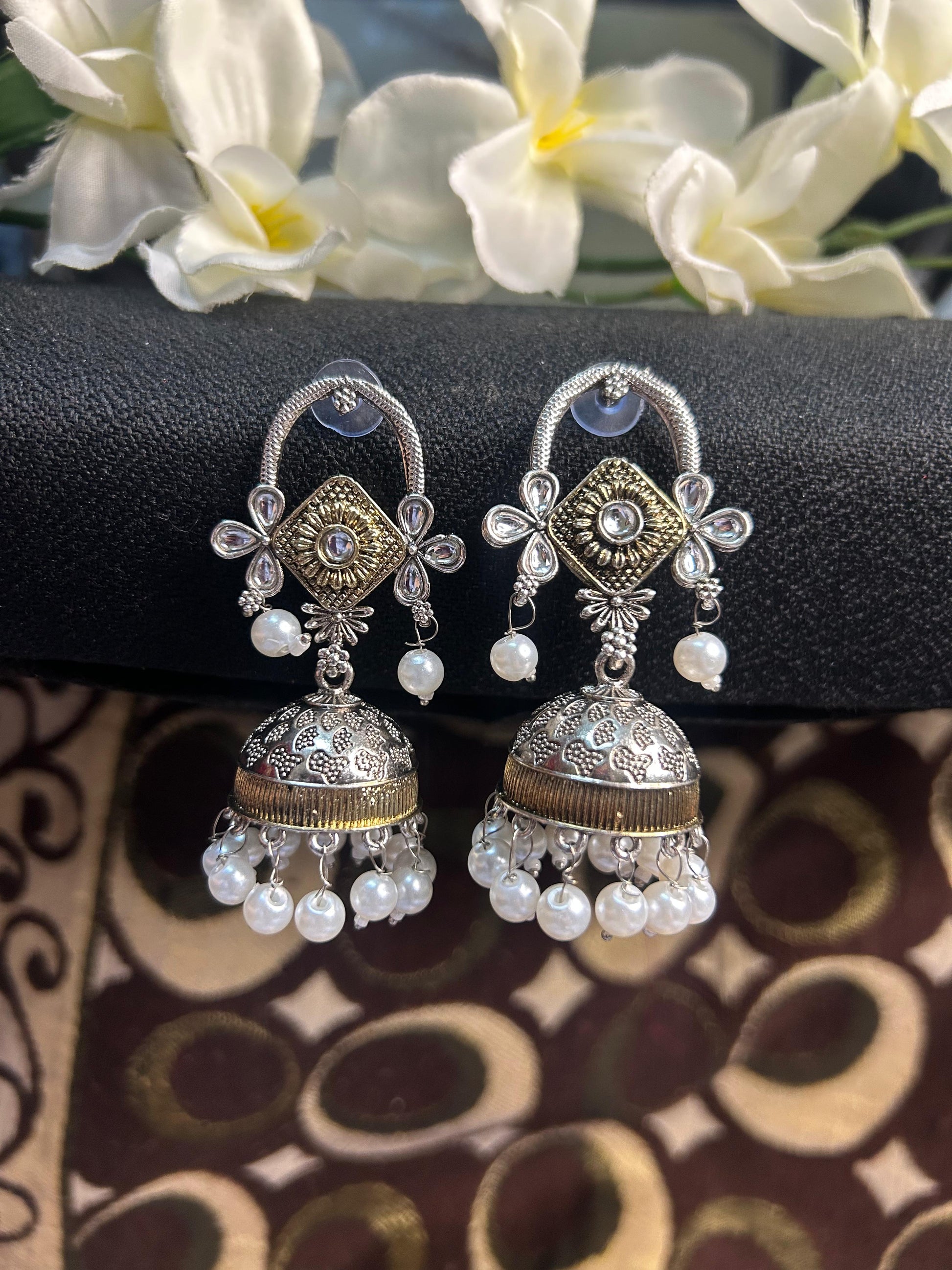 Elevate your jewelry collection with the Diamond Top Silver Gold Jhumka, a sophisticated blend of timeless elegance and expert craftsmanship. The intricate jhumka design pairs lustrous silver and gold tones with a dazzling diamond accent, offering both durability and refined style. Perfect for special occasions or enhancing everyday attire, this piece promises a classic yet contemporary appeal crafted to last.